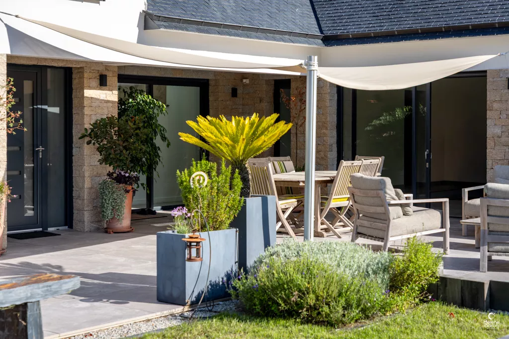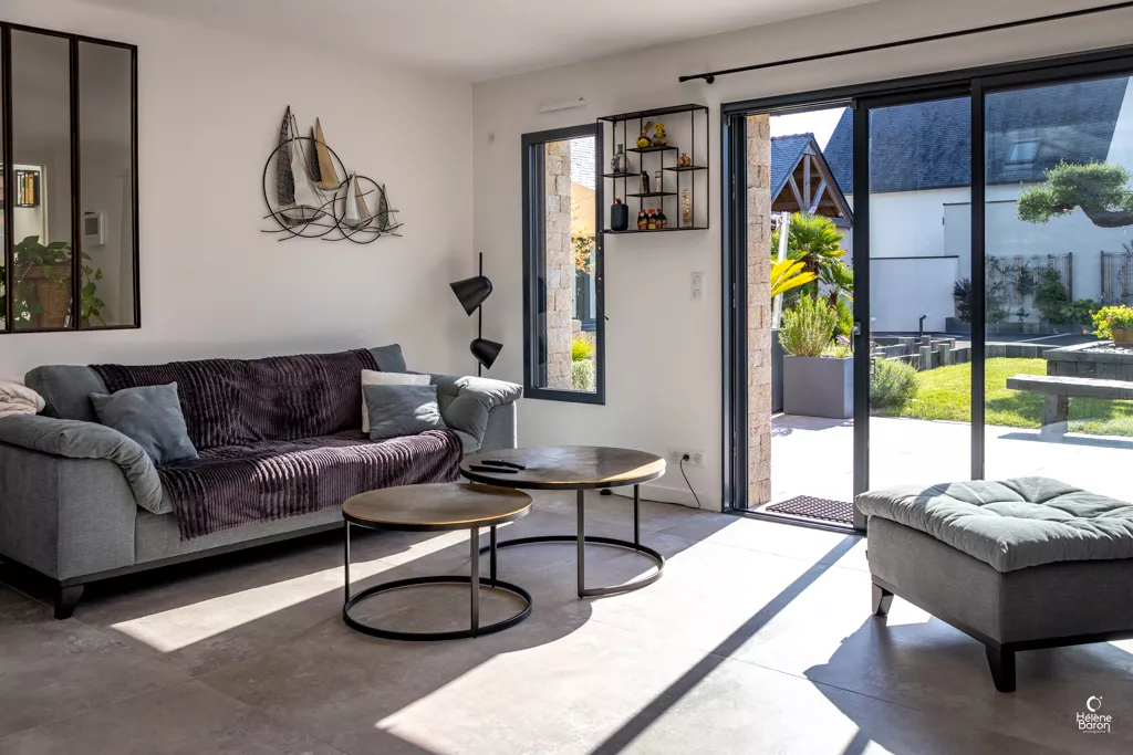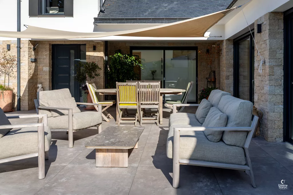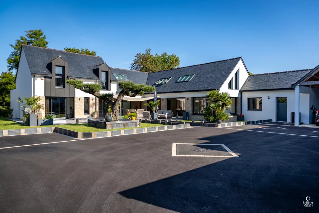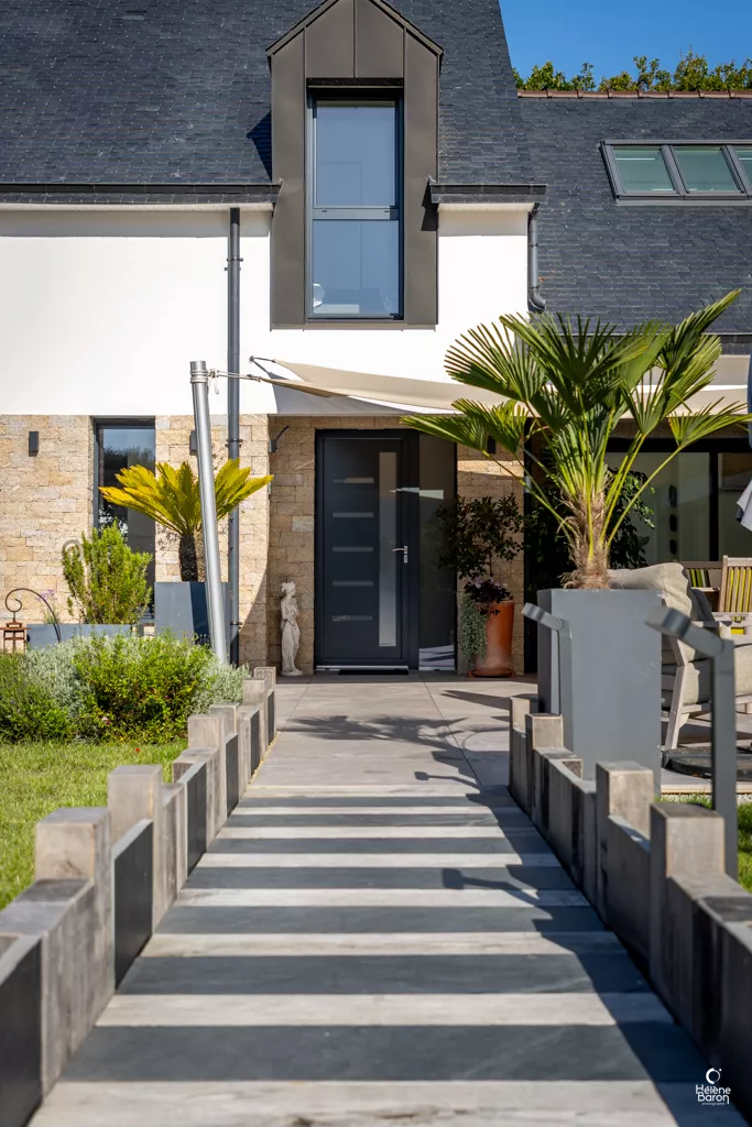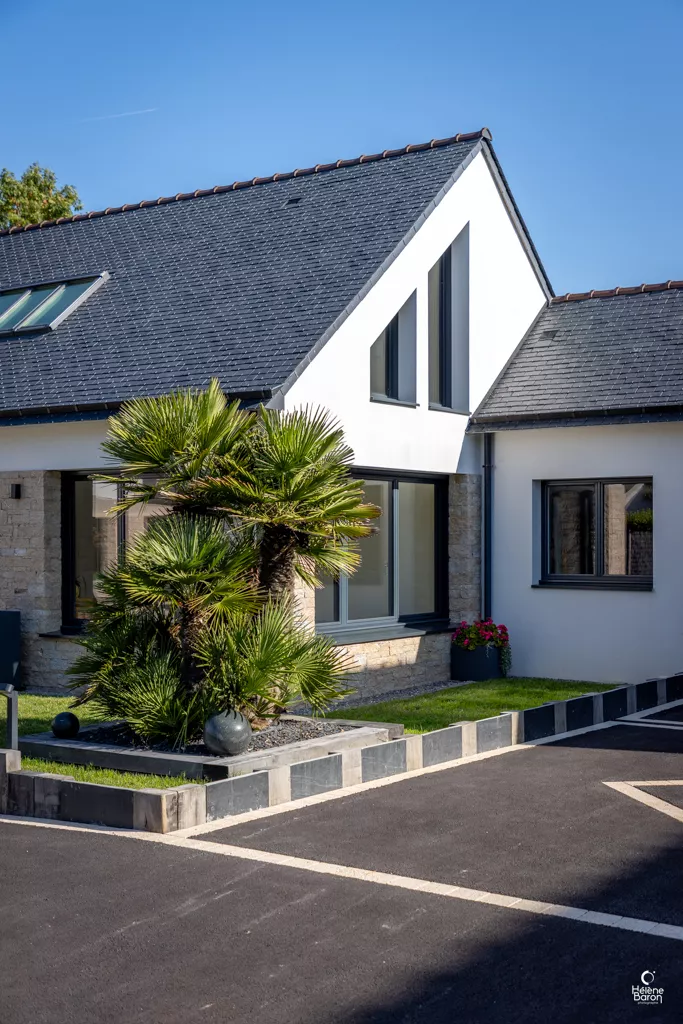 Les façades sont habillées d’un parement en pierre issu d’une carrière locale, située à Elven, un choix de proximité qui confère naturellement à l’ensemble sa teinte beige caractéristique.