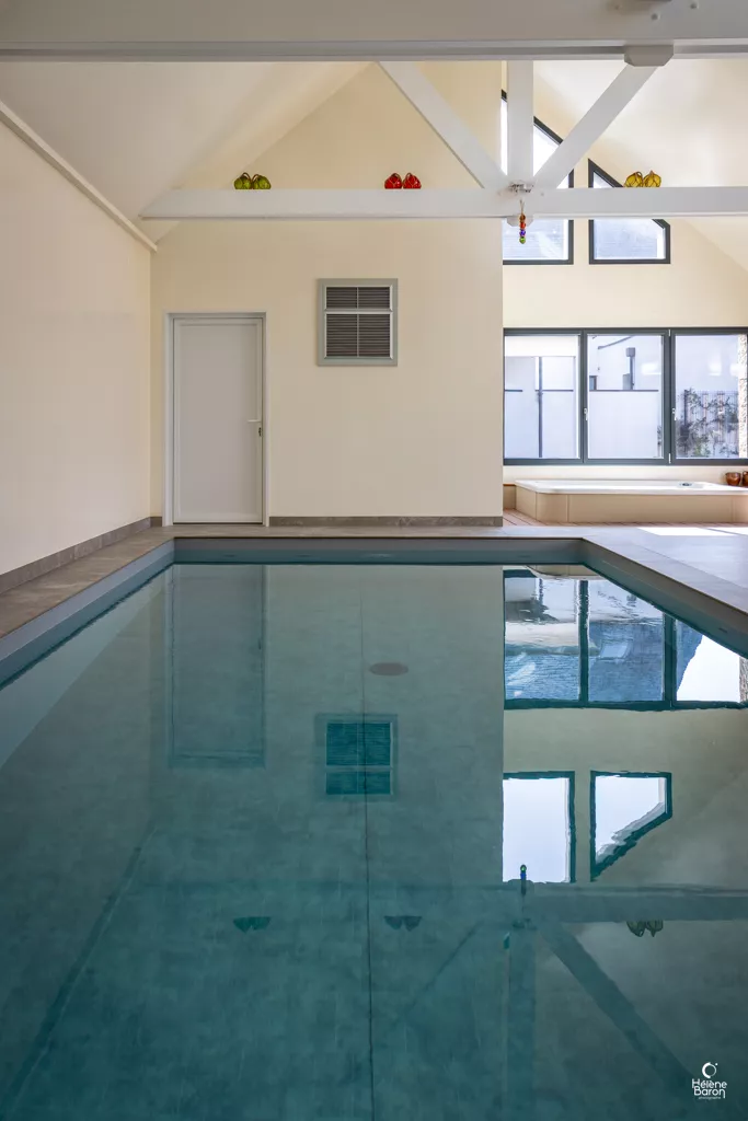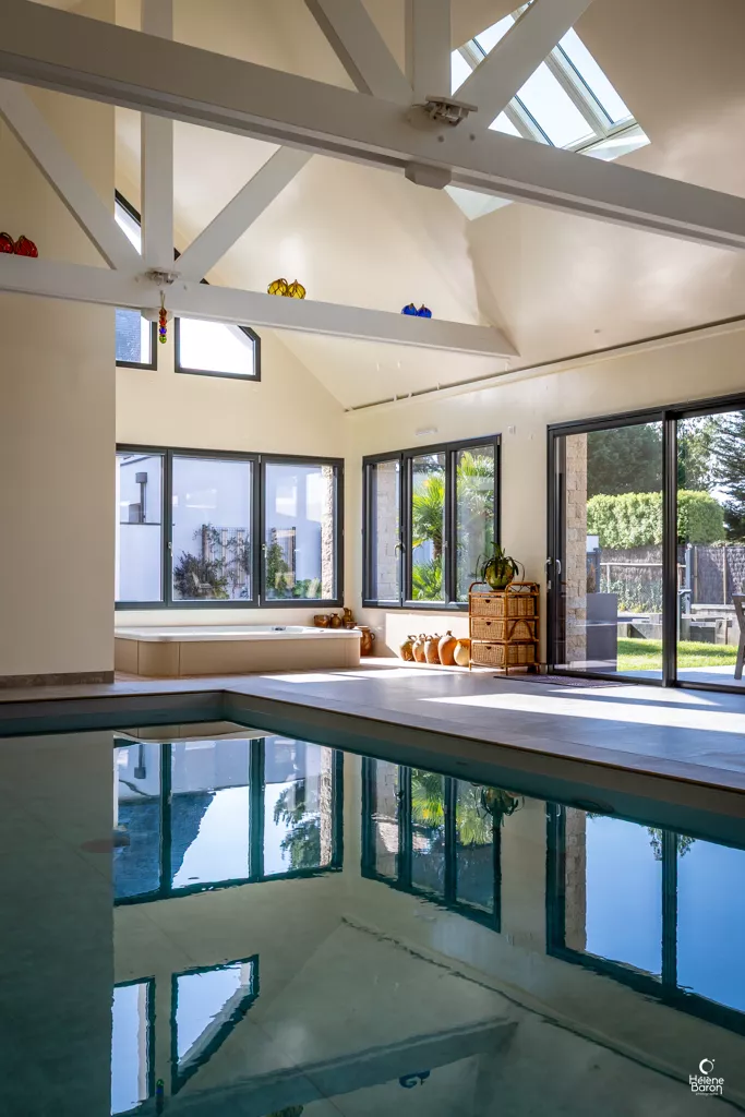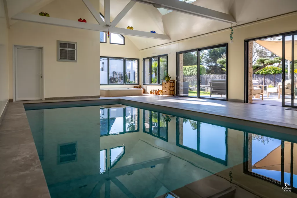 Implantée à Saint-Gildas-de-Rhuys, sur la presqu’île de Rhuys, cette maison traditionnelle de grande dimension se distingue par son plan en "L" et l’intégration d’une piscine couverte, pensée comme un véritable espace de vie.