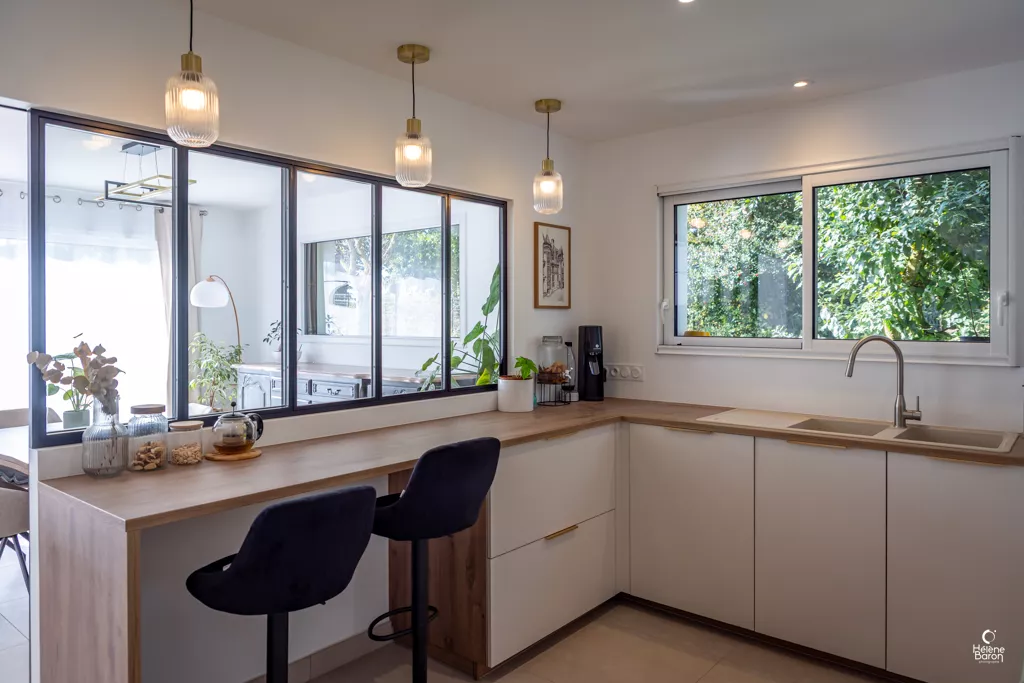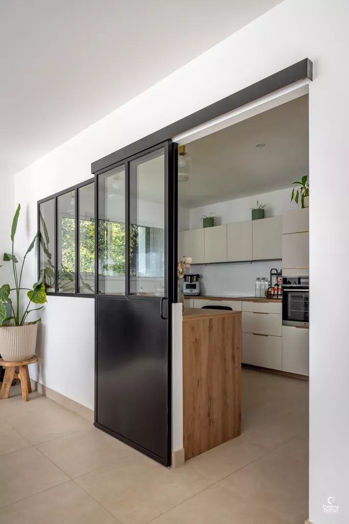 À l’intérieur, la cuisine adopte un principe ouvert mais visuellement séparé grâce à une verrière, apportant structure et transparence.