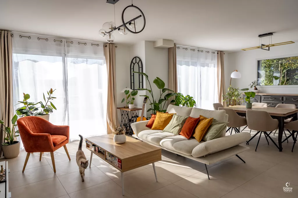 La maison présente une architecture contemporaine, associée à une couverture en bac acier et à des ouvertures favorisant les échanges avec les espaces extérieurs.