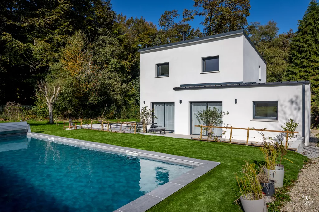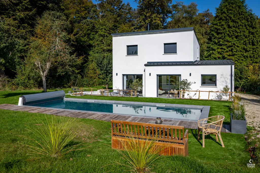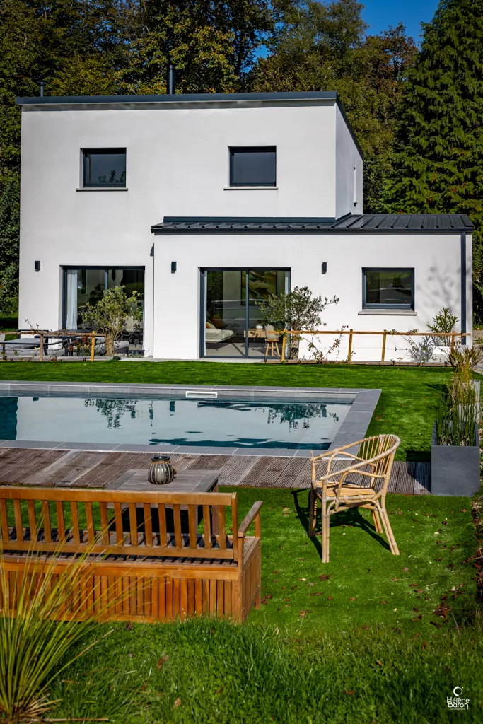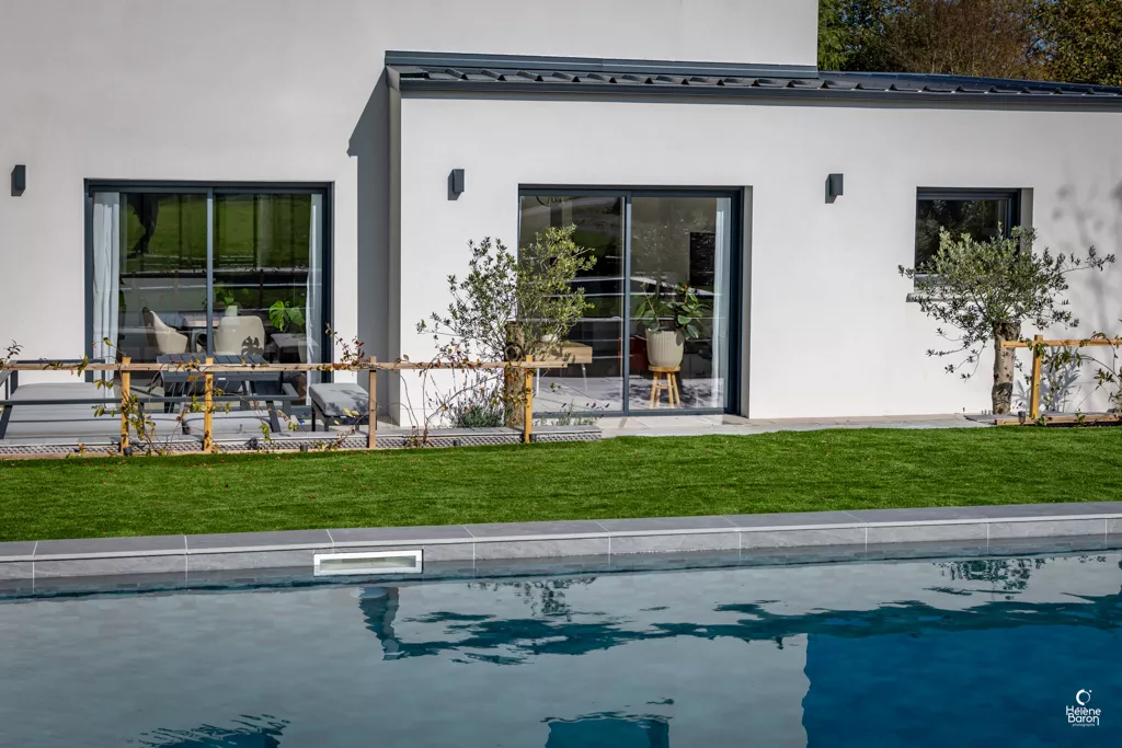 Les espaces extérieurs s’organisent autour d’une piscine et d’une terrasse en carrelage sur plots, pensée comme un prolongement naturel de la maison.