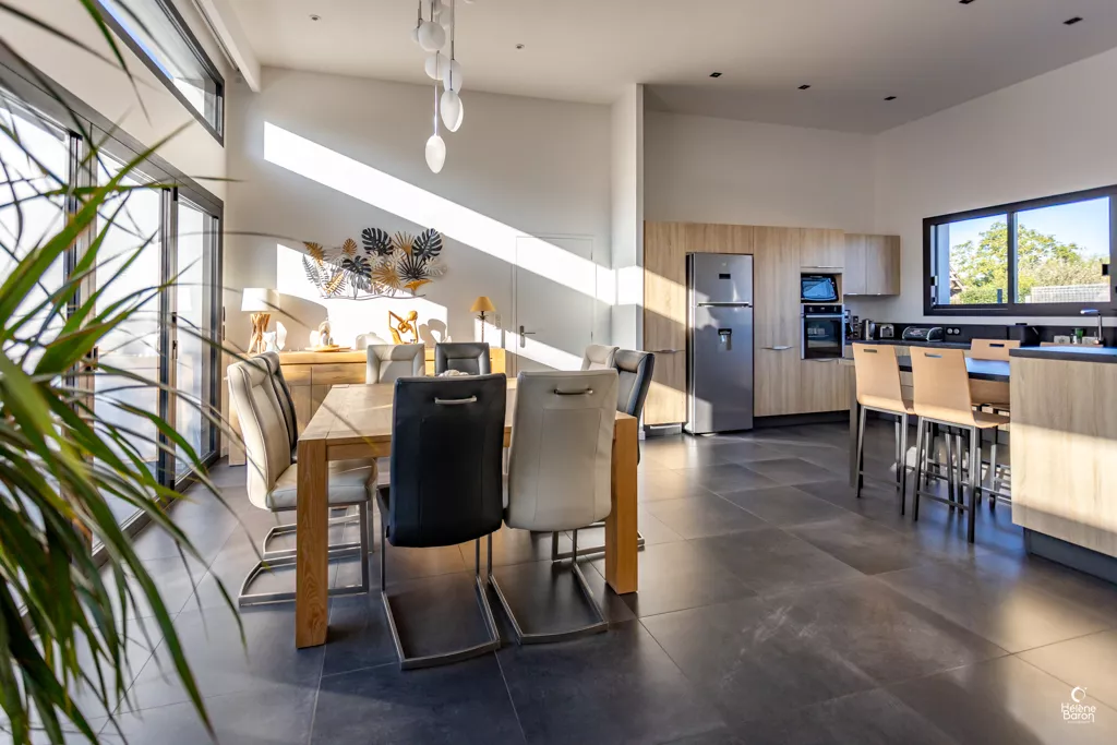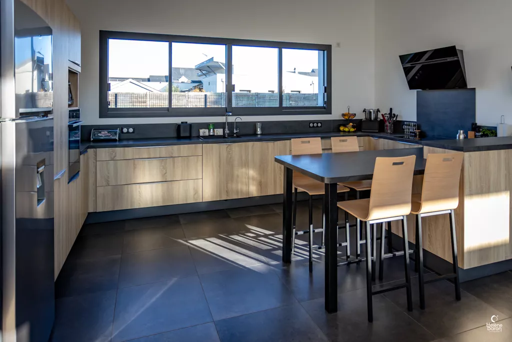 La cuisine, elle, adopte un esprit atelier grâce à une fenêtre coulissante panoramique et à des ouvertures complémentaires en partie haute, favorisant les apports de lumière naturelle.
