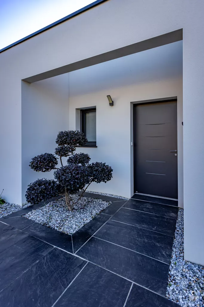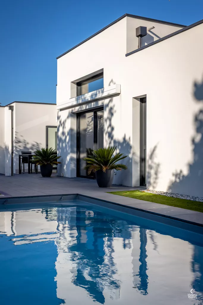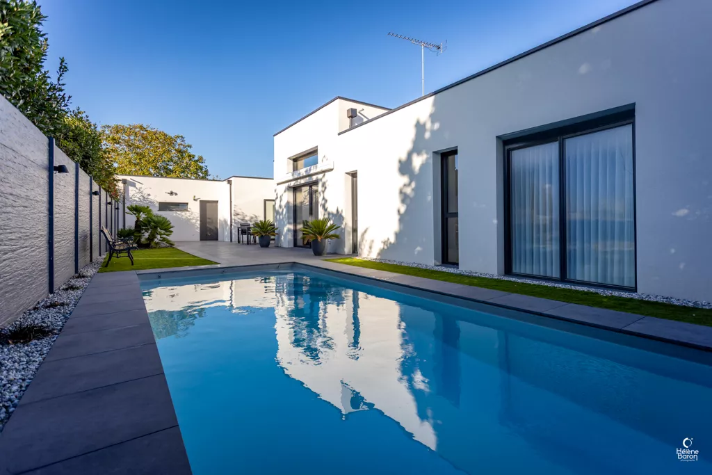 À Nort-sur-Erdre, en Loire-Atlantique, cette maison contemporaine à toit plat intègre une piscine extérieure et un garage au sein d’un ensemble architectural sobre et lisible.