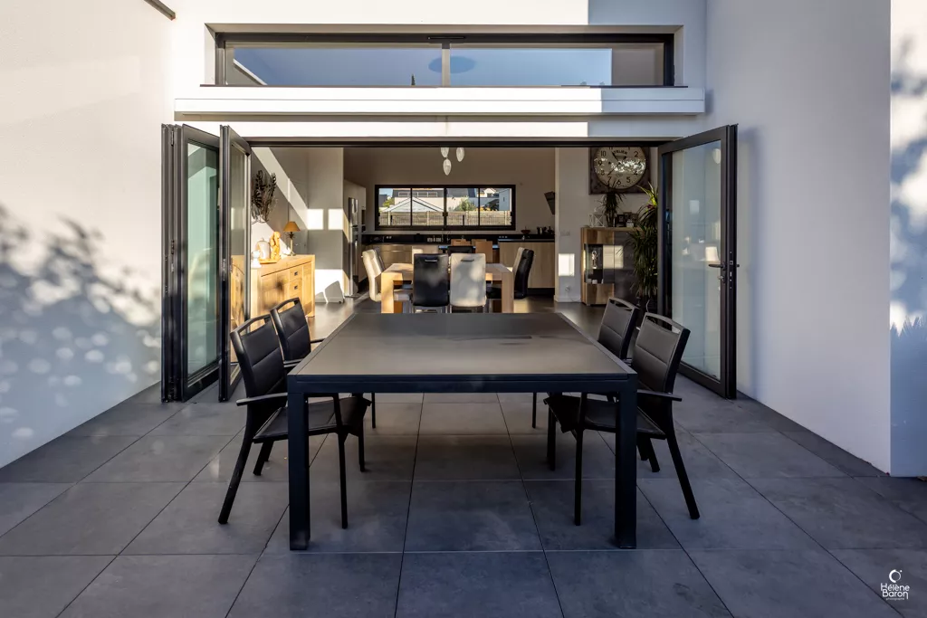 Autre détail technique qui fait la singularité de cette demeure : Une porte accordéon qui relie la salle à manger à la terrasse, permettant une ouverture totale sur l’extérieur. Le même carrelage est utilisé à l’intérieur et à l’extérieur, effaçant la frontière entre les espaces.